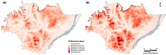 Approximate drilling time maps for (A) two-inch diameter boreholes, and (B) four-inch diameter boreholes.