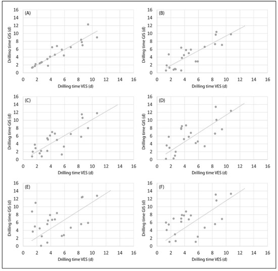 Drilling time estimates obtained by two independent methods (vertical electrical sounding and the GIS database). Times are referred to three-inch diameter boreholes. (A) Ordinary kriging; (B) minimum curvature; (C) polynomial regression; (D) modified Shepard’s method; (E) inverse distance to power; (F) radial basis function.