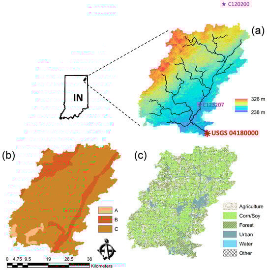 Cedar Creek Watershed characteristics: (a) elevation (National Elevation Data (NED) 30 m) with the stream and precipitation gauging stations shown; (b) soil hydrologic group (State Soil Geographic (STATSGO) 250 m); and (c) land use (reclassified from NASS 2010 Crop Data Layer (CDL) 30 m).