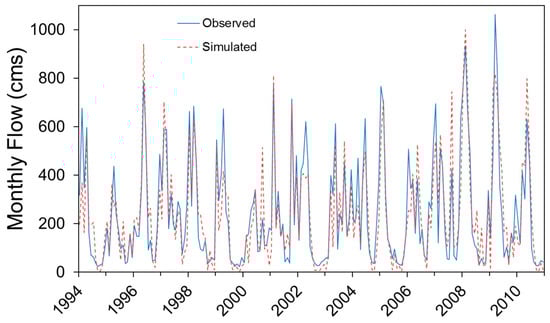 Comparison of observed and simulated monthly flow at the watershed outlet for the baseline 30-m Cedar Creek HRU model. Calibration period is 1994 to 2003, and the validation is 2004 to 2010.