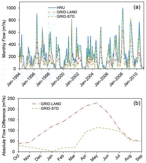 Hydrologic simulations for 90-m resolution models’ (a) monthly hydrographs and (b) average monthly absolute flow difference relative to the HRU model.