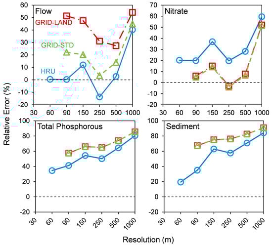 Models’ results were also evaluated in terms of relative error compared to the baseline 30-m HRU model for both flow and water quality. Relative error, average annual discharge and average flow rate shown in Figure 4 and Table 6 indicate that the models follow a similar trend, but that the magnitude of the relative error differs. For the HRU approach, the differences in flow range from <1% to 38.2% and remain under 1% relative error until 90 m. The two GRID approaches follow similar trends with a decrease in relative error from 90- to 250-m spatial resolution, followed by a marked increase in error from 500- to 1000-m resolution. Maximum relative error occurred at 1000 m for all models and a minimum at 90 for HRU, 500 for GRID-LAND and 250 m GRID-STD models, respectively. These differences indicate that discretization and routing do not have a uniform effect on model output, but are both contributing to error. It is likely that decreased flows in the GRID models is due in part to the landscape routing approach moving water from grid to grid, rather than directly to the channel as with standard routing. This allows more opportunity for water to be used in evapotranspiration, infiltration and otherwise be diverted from becoming channelized flow.