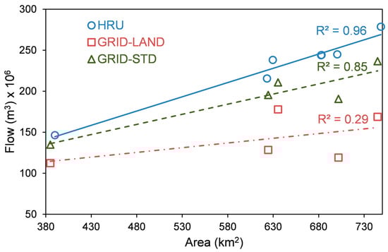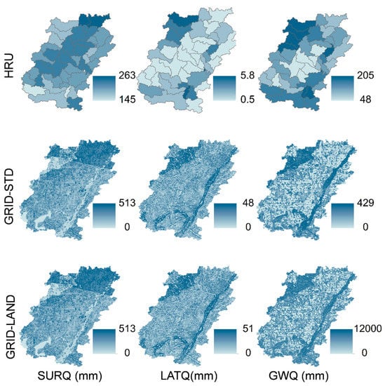 Observed networked flow patterns for the GRID-LAND model are not present in the GRID-STD where landscape routing is removed, as there is no connection of flow components between grid cells. Very high values were observed for some cells of the GRID models, which are the aggregation of landscape flow from several cells. This seems to have occurred in a relatively small fraction of the total cells and had previously been observed and discussed by Rathjens et al. []. Overall, the results demonstrate that not only does landscape position matter in simulation, but the spatial distribution of land use and soils is also important.