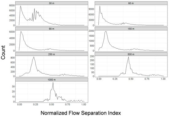 Changes in total watershed area between modeled resolutions is expected to contribute to differences in predictions, where increasing area should lead to increasing flow and nutrient loads. While lower flow was observed on a unit basis for the GRID models (Figure 3 and Figure 4), the relationship between flow and total watershed area was examined for all resolutions of each model type (Figure 5). Although the HRU and GRID-STD approaches follow an expected monotonic relationship of increasing flow with increasing area, for the GRID-LAND approach, this relationship is less pronounced. The key difference between approaches is the use of the flow separation index. Frequency plots of the flow separation index by resolution (Figure 6) show the shift from lower values to high values as resolution is reduced. Given that there are fewer pixels to generate flow at coarser resolution, the flow separation index increases in order to generate more channelized flow. Thus, the GRID-LAND approach relies on both watershed area and the magnitude and distribution of the flow separation index. While previous research has found this index to be highly sensitive to resolution [] and difficult to validate [], these results suggest that the GRID-LAND approach responds appropriately by increasing the amount of water that is channelized to account for the smaller number of available grid cells.