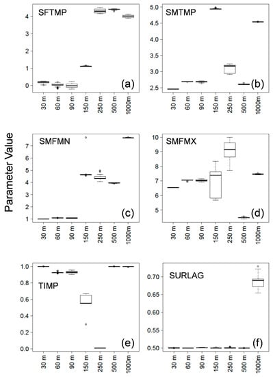 Individual parameter ranges from calibration simulations are shown in Figure 8. For all six calibrated parameters, values tended to be similar in the 30 to 90 m range. This suggests, specific to this model and study area, that parameters may be transferable up to 90 m. However, the scale dependency of parameters must be carefully considered for each model application, as they are often dependent on how landscape representation is aggregated []. Previous research has similarly identified a spatial input range of up to 100 m as suitable for watershed modeling [,,,], although it is empirically based. While response varied by parameter, trends emerged in accordance with expected watershed response. For snow-related parameters for resolutions coarser than 90 m, values trended toward less snow and more water available. For these regions, there is less area to generate flow, with the exception of the 250-m model. Accordingly, the 250-m model shows an opposite trend towards creating and preserving snow, thus lowering flow at the outlet.