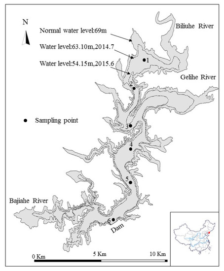 The location map of sampling points is shown in Figure 1 and Figure 2. Samples are collected from July 2014 to June 2015, and December, January, and March belong to the freeze-thawing period which cannot be sampled. In order to simplify the problem, this study considered only the monitoring points in the main stem of Biliuhe Reservoir (Figure 1 and Figure 2). During the monitoring periods, the water level decreases from 63.10 m to 54.15 m and the difference of the water level is 8.95 m. Correspondingly, the water boundary changes. Water samples are collected in accordance with specific conditions: collect one water sample if the water depth is less than 5 m; collect two water samples separately from surface and bottom layer when the depth is between 5 and 10 m; and collect samples every 5 m when the depth is over 10 m. Sediment samples were collected in October 2014, including points 1–6. As the water level fluctuates, the relative positions of the sampling sites change accordingly. To solve this problem, a dynamic sampling method is developed as follows: (1) Cover as many planned sampling sites as possible; (2) add the number of sampling points when the water level is at a high depth; (3) retreat or cancel the relevant sampling points when the water level is at a low depth. A Garmin GPS (GARMIN Corporation, Shengyang, China) is used to mark the sampling point and collect the location information. The water samples are sampled with Niskin bottles (HYDRO-BIOS), the sediment samples are collected by a Van Veen sampler (KC-Denmark). Monitoring indicators of water samples cover dissolved oxygen (DO), total phosphorus (TP), total nitrogen (TN), ammonia nitrogen, chemical oxygen demand (CODMn), pH, iron, and manganese. Monitoring indicators of sediment samples include total nitrogen and total phosphorus. The water samples were carried out in accordance with the “Water and wastewater monitoring and analysis method (Fourth Edition), Beijing: China Environmental Science Press, 2002”. The sediment samples of total nitrogen and total phosphorus were measured by Kjeldahl determination and the Standard measurements and testing (SMT) protocol method [2,5]. The monitoring results were expressed with average values and the errors of the parallel experiments were less than 5%.