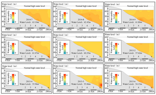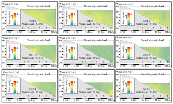 It can be easily seen in Figure 3 that the water level is reduced from 63.10 m to 54.15 m and the water boundary is clear. The water quality is fine (2.36), overall, and worse in summer and better in winter, overall. The monthly average water quality level in July, August, and September in 2014 are 2.39, 2.35 and 2.37, respectively. The monthly average water quality level in February in 2015 is 2.27. The change of the comprehensive water quality level is in accordance with the actual reservoir environmental change. During summer, heavy rainfall would import a large amount of pollutants, which decrease the water quality. Meanwhile, the thermocline would impede the dissolved oxygen exchange, which contributes to the anaerobic environment at the bottom and sediment pollution release [34,35]. In winter, small amounts of runoff carry relatively fewer pollutants into the reservoir, which is in quiescent state, overall, and low temperature can also promote the increase of dissolved oxygen [36]. Meanwhile, the water quality shows the tendency of becoming better from upstream to downstream (dam) where the average level of the water quality is 2.31, and is better than others. The process of hydraulic transport agrees with this trend [37]. The water quality in the surface layer is better than that in the bottom layer because of sediment pollution, which influences water quality by releasing contaminants and consuming dissolved oxygen [38]. The comprehensive water quality indices in the surface layer of Points 3–6 are 2.34, 2.33, 2.27 and 2.27, respectively, while in the bottom layer the indices are 2.62, 2.63, 2.42 and 2.42. This case also occurred in July 2014, September 2014, and June 2015, which are mainly in relation with the change of dissolved oxygen. Thus, the influence of sediment pollution should be considered in the water quality assessment.