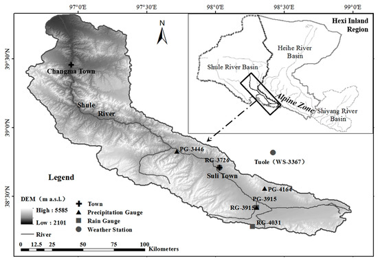 The Shule River originating from the western part of the Qilian Mountains on the northeastern margin of the Qinghai-Tibetan Plateau is the second largest inland river system in the Hexi Corridor of China. The major upper part of the basin lies in alpine mountains, and precipitation, which is more abundant, plays a decisive role in the basin water resources. In recent decades, the hydro-meteorological characteristics of the Shule River basin and its surroundings have been undergoing significant change, and a series of problems related to ecosystem degradation and water use efficiency have become increasingly prominent [20,21]. Therefore, it is necessary to construct an integrative water management system at the catchment scale for the Hexi inland region [22]. Until now, however, discussion on the precipitation of the upper Shule River has relied only on data from the Tuole station, which is the nearest national weather station, as measured results from the alpine zone have not yet been reported. Therefore, a high degree of uncertainty still exists, and any conclusions are controversial. For these reasons, based on field observation data from the upper Shule River (3400 m–4200 m) and daily precipitation of Tuole station during 2009–2015, the distribution characteristics of alpine precipitation in the main time scales as well as their vertical differentiation were evaluated in this paper. Based on a comprehensive literature review, it is believed that the basic features of precipitation in the upper reaches of the Shule River are unexplored. Consequently, the basic features of precipitation in the upper reaches of the Shule River as well as discussions about the characteristics of alpine precipitation are synthesized in this study. The results may provide theoretical support or new thinking about the subsequent scientific research on the hydrological cycle and water resource management in mountainous regions as well as inland river basins.