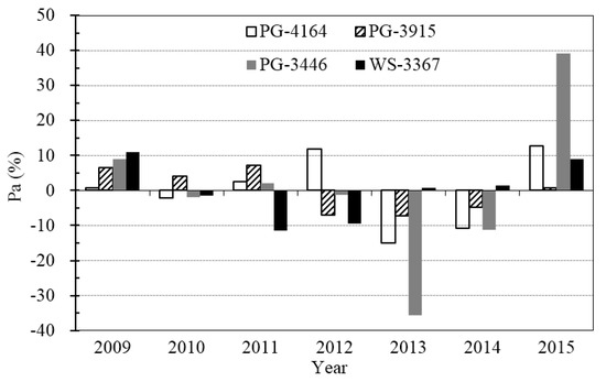According to the results from 2009 to 2015, in-situ observed annual precipitation and its inter-annual variations at meteorological stations (PG-4164–PG-3446) differ from the Tuole weather station (WS-3367), some are even dramatically opposite (Figure 2). Among them, annual precipitation of PG-3446 was always the lowest, with an average of 224.9 mm. Temporal analysis of the annual precipitation of PG-4164, PG-3915 and WS-3367 suggested that a change in magnitude was following a sharply increasing trend, and their annual average precipitation values were 377.5 mm, 367.0 mm, and 355.8 mm, respectively. In terms of inter-annual fluctuations, a clear majority of Pa (from −14.9% to 12.7%) fell within normal levels, and less (−35.7%, 2013) or more (39.3%, 2015) only occurred once in PG-3446 (Figure 2). Similarly, the coefficient of variation (Cv) did not exceed 0.10, except for PG-3446 (0.22), which was on the high side. Using a monthly scale, the inter-annual fluctuation of precipitation increased substantially, but the distribution of Cv showed significant differences (Figure 3). Generally speaking, the Cv was above 0.8 when monthly precipitation was lower than 20 mm. Conversely, the Cv was basically stable at about 0.4. Furthermore, the relationship between the Cv and average monthly precipitation can be described by a power function equation (statistically significant at the 99% confidence level), and it was applicable whether or not the elevation was consistent (Figure 3). Thus, generally or individually, the annual precipitation figures were basically stable, and the inter-annual variability was occasionally somewhat larger at low altitude zones with low precipitation. With a decrease in the time scale, the inter-annual fluctuation of precipitation increased clearly, but its variability showed a spatial-temporal distribution characteristic of being highly negative that correlated with precipitation.