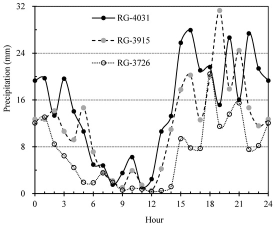 Considering the low proportion of solid precipitation, the accuracy of the data and other factors, the analysis on diurnal variation of precipitation only uses the rainy season (from 23 May to 6 September) in 2013, which has a similar result and no significant snowfall event, as an example. During this period, the total precipitation accounts for about eighty percent of the annual precipitation. As can be seen from the distribution of hourly precipitation (Figure 5), the characteristic of diurnal variation is very distinct, with the minimum value located at 1100 or 1200 Local Standard Time (LST), and the maximum value appearing in the 1600–1900 LST. In addition, for convenience of the following analysis, the precipitation rates hour by hour of three sites are divided into high precipitation and low precipitation according to whether or not they are higher than their respective averages (RG-4031: 14.5 mm; RG-3915: 11.6 mm; RG-3726: 6.6 mm). After this processing, it can be found that the precipitation of the three sites showed great differences, but the concentrated hours (0400, 0600–1400 LST) of low precipitation were uniform, and differed (RG-4031: 0200, 0500 LST; RG-3915: 0300, 2300 LST; RG-3726: 0300, 0500 LST) only individually. In addition, the proportion (RG-4031: 24.8%; RG-3915: 23.8%; RG-3726: 15.3%) of low precipitation accounted for in the total precipitation displayed a continuously declining trend with a decrease in altitude. For an in-depth understanding of this phenomenon, the diurnal variation of precipitation frequency and precipitation intensity was further analyzed using the same method, and the results were broadly similar. Among them, the most unexpected is that the vertical change trends of the two are very different. During the corresponding hours of their respective low precipitation for above three sites, the proportion of precipitation frequency increased with the decline of elevation, which accounts for 36.8%, 40.2% and 55.3% of the total number over a duration of 24 h (Table 4). The precipitation intensity was just the opposite, i.e., about 0.69, 0.60 and 0.24 times of the average throughout the day (Table 4). The above results indicate that the alpine precipitation occurred mainly in the afternoon to midnight (1500–0100 LST), and this characteristic would become more and more obvious with a decrease in altitude. Nevertheless, the causes are not consistent; the higher altitude areas were mainly dominated by the precipitation frequency, while the lower altitude region usually depended on the precipitation intensity.