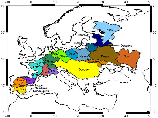 Study area: 26 European river basins, which are aggregated to 17 catchments as indicated by the different colors.