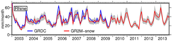 Discharge R for the Rhine from Global Runoff Data Centre (GRDC) (blue) and simulated from Génie Rural rainfall-runoff model (GR2M)-snow (red) including the standard deviation (grey).