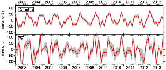 The noise of depends mainly on the size and the shape of the target areas [49]. For example, the Danube has a smooth time series with standard deviations of about 10 mm/month, while the time series of the Po is very noisy, and the standard deviations reach up to 30 mm/month, which is half of the annual amplitude (Figure 4). In fact, with a size of only 70,000 km, the Po basin is likely too small for obtaining reliable TWS information from GRACE.