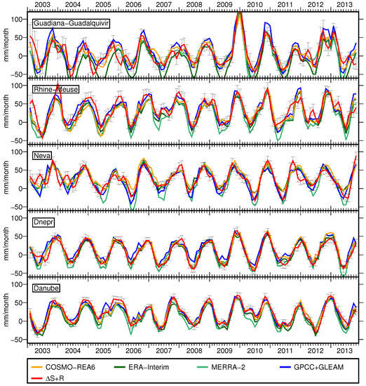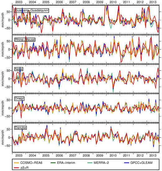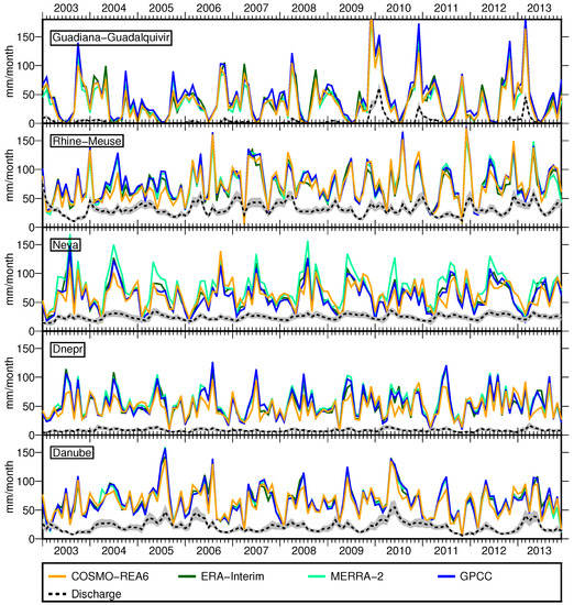 Monthly total precipitation is highly variable for European river basins (Figure 5). The chosen catchments represent different climatic conditions over Europe, e.g., there is nearly no precipitation in summer in Guadiana-Guadalquivir; Neva has a very pronounced annual cycle; and in Rhine-Meuse, individual precipitation events are visible. All model-derived time series show similar features as the observation-based dataset GPCC. However, while in the Danube basin, peaks from all models have about the same size, we find in the Dnepr and Neva basins smaller peaks for the COSMO-REA6 model compared to the other datasets. The authors of [54] showed that COSMO-REA6 has an enhanced skill in representing individual precipitation events compared to ERA-Interim. Moreover, the authors of [9] found that COSMO-REA6 and ERA-Interim overestimate P over parts of Russia and parts of the Alps compared to GPCC. In our study, this is confirmed by particularly high P rates in the Rhone basin for COSMO-REA6 with a temporal mean of 90 mm/month and peaks of up to 180 mm/month. Furthermore, in line with [9], we found that all reanalyses underestimate P in the catchment of Garonne-Loire-Seine compared to GPCC. Besides, MERRA-2 simulates exceptional high P rates in the Neva basin where its temporal mean is more than 10 mm/month higher than the temporal mean from the other datasets.