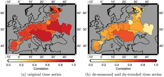 Best agreement between de-trended and de-seasoned and is achieved for the Danube with correlations of about 0.7 (Figure 9b). In most basins, the correlation is about 0.5, with a few exceptions like the Ebro, Neman, Don and Neva, where correlation is smaller than 0.3. Especially in smaller basins, outliers in the GRACE time series have a huge impact on correlation. Furthermore, in some basins, the agreement between and changes with time, e.g., in the Guadiana-Guadalquivir and Neva basins, models and disagree during the first three years of the study period, but then again match very well (Figure 8).