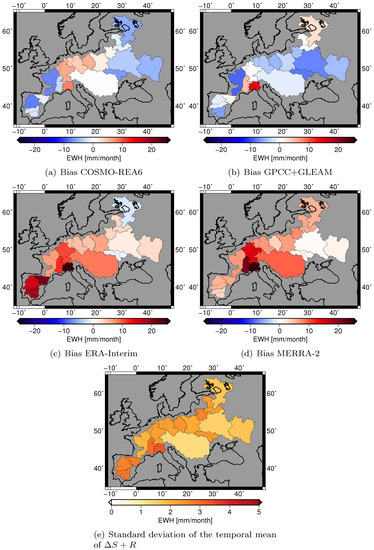 (a–d) Bias of the water budget equation given in equivalent water height (EWH): red color means that is underestimated, and blue color means that is overestimated. (e) provides as a reference the propagated error of the left side of the water budget equation.