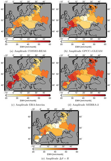 A more complete picture of the closure of the water budget is obtained by analyzing the amplitude, phase and trend of and derived from the parameters estimated from Equation (4). The amplitude of is predominantly affected by modeled evapotranspiration, which differs largely for the individual models (Figure 6). The regional patterns and the magnitudes of the amplitudes of COSMO-REA6 fit well to the amplitudes of with exceptions only in a few basins, e.g., on the Iberian peninsula (Figure 11). In contrast, GPCC in combination with GLEAM and ERA-Interim overestimate the amplitude of with respect to GRACE by 15–20 mm/month in all basins west of the Rhine. The amplitude of from MERRA-2 is particularly large in the French basins, the Rhine and the eastern basins with values of about 50 mm/month. The Danube basin stands out as all time series and also agree very well regarding the amplitude with values between 31 and 35 mm/month. While COSMO-REA6 and ERA-Interim have nearly no phase shift, MERRA-2 and GPCC+GLEAM are contaminated with phase shifts of up to 10 days.