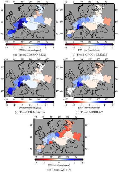 Negative trends in fluxes imply increasingly fast drying; positive trends mean that a region experiences increasingly fast wetting. Within the time span considered here, all models agree that eastern Europe tends to become more and more dry and central and northwestern Europe more and more wet (Figure 12). This conclusion is confirmed by ; however, GRACE and discharge time series indicate larger negative trends in eastern Europe than the models. The authors of [55] found similar trend patterns investigating runoff over Europe, with negative trends over eastern Europe and positive trends over northwestern Europe for the time period 1963–2000. In contrast, the authors of [3] found negative trends for changes of between 1976–2005 and 2070–2099 in our whole study region. The authors of [56] compared P and E for the time periods 1948–1968 and 1985–2005 and identified drying trends over parts of eastern Europe and the Iberian peninsula, but no sign of wetting trends over northwestern Europe. The largest positive trends in northwestern Europe are found by COSMO-REA6 with 1–3 mm/month/year. Over the Iberian peninsula, the results are unclear. While ERA-Interim and COSMO-REA6, reanalyses show positive trends of on the Iberian peninsula; GPCC + GLEAM and identify positive trends only in the southern catchment Guadiana-Guadalquivir and negative trends in the northern part of the peninsula; and MERRA-2 indicates no trend at all.