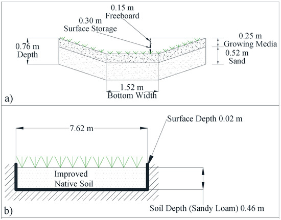 In the pre-BMP scenario in Figure 1, the vegetation cover was represented by turf or prairie grass. No underdrain was considered for the implemented BMPs. As the first step, the BMPs were modeled with typical dimensions reported in the literature [2,22,24,25,26]. These dimensions and cross sections are shown in Figure 2 for a bioswale, infiltration trench, and vegetated filter strip.