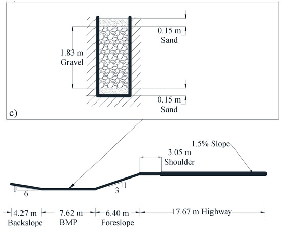 Characteristics such as soil types and geologic conditions, and adjacent land uses, highway type, amount of open space in medians and shoulders, shoulder width and usage, highway landscaping and vegetation, and maintenance access all affect runoff volume reduction [3]. Measured percentage runoff volume reduction for vegetated filter strips is about 40% to 85% and for vegetated swales is from 50% to 94% [4,5,6]. Studies demonstrated almost 100% mitigation capacity for infiltration trenches [7,8]. The wide range in performances can be due to the sizes of the studied BMP relative to the contributing watershed area, the site conditions, and the quality of maintenance. Many of these performance measurements were conducted several years after construction of BMPs and depending on their maintenance quality, their functionality may have deteriorated by the time of monitoring [9]. Other limitations include: (1) many details of these measured sites are not known; (2) these measurements were evaluated in localized areas and most often not for linear projects. Many numerical studies of BMP performances were also conducted [10,11,12,13,14,15]. However, for practical applications, the BMP performance analysis lacks integration with cost analysis.
