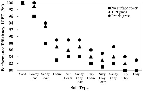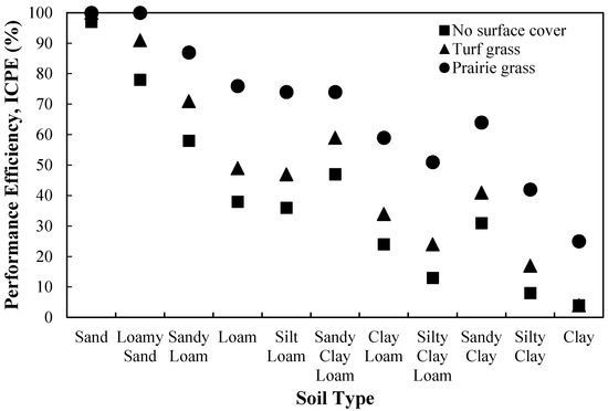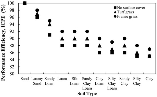 As shown in Figure 4, bioswale implementation resulted in average performance efficiency (i.e., ICPE) of 89%, 90%, and 92% in runoff volume reduction from 25.4 mm (1 inch) rainfall, for sites with no vegetated surface cover, turf grass, and prairie grass, respectively. Moreover, the ascending trend of performance efficiency is repeated from clayey to sandy soil type in the range of 85% to 100% regardless of vegetated surface cover. The differences in efficiency among different vegetated covers are not as distinct as for pre-BMP scenarios. This indicates that establishing vegetative covers does not have the magnitude of impact as without BMPs.