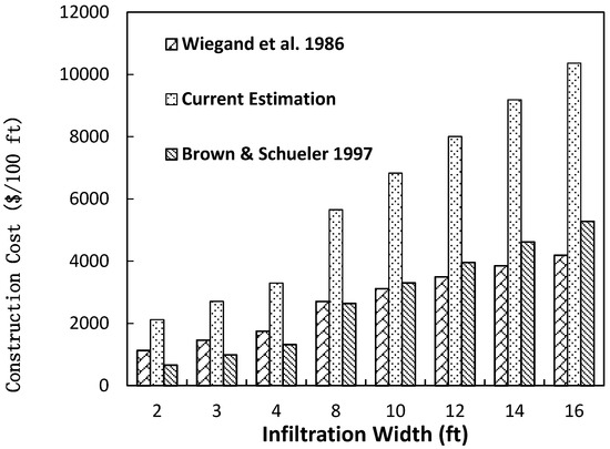 Following the methodology presented earlier, the construction and maintenance cost of the considered BMPs have been determined. The construction cost for a bioswale, infiltration trench, and vegetative filter strip to capture 25.4 mm (1 inch) rainfall per 30 m (100 ft) highway was $16,291, $4379, and $207, respectively. There are some other studies that evaluate the construction costs [2,28], however, any direct comparisons with those studies are difficult as the reported costs are based on volume of constructed BMP without providing detail for what locations and what specifications. Nevertheless, a comparison of the construction cost of infiltration trench in this study with other studies [29,30] is shown in Figure 6.