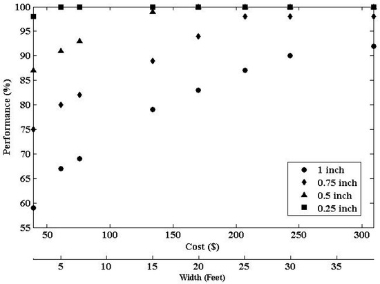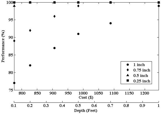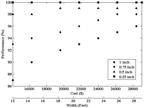 Since both performance and cost of BMPs are significantly dependent on the magnitude of rainfall, it is very useful for decision makers to know the required sizes that can capture 100% runoff produced by 6.35, 12.7, 19.05, and 25.4 mm (0.25, 0.5, 0.75, and 1 inch) rainfalls. These analyses were conducted using the discussed idealized catchment with a single implemented BMP and assuming silt loam as the soil type and turf grass as surface cover. One of the main contributing parameters in performance of the bioswale and VFS is their widths which correspond to their coverage area for linear projects. For infiltration trenches, the depth of the BMP is considered most relevant. Therefore, the width variable for the bioswale and VFS and the depth variable for the infiltration trench is considered in determining the sizes required to capture all stormwater runoff produced by 6.35, 12.7, 19.05, and 25.4 mm (0.25, 0.5, 0.75, and 1 inch) rainfall from the idealized catchment. Then, the associated cost for construction and maintenance of these BMPs are assessed to allow decision makers and designers to optimally select the appropriate BMPs.