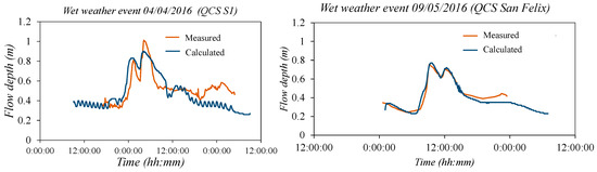 The comparison of the measured and simulated flow depth is shown in Figure 4. In wet weather, two different events are presented. Some differences are found in S1 Catchment, whereas a quite good agreement is observed in San Felix Catchment. Those differences, which are below 10%, are caused by pump stations.