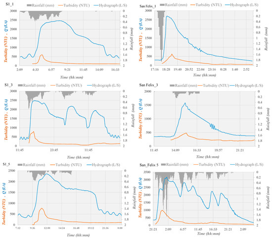 The hydrographs and turbidity-pollutographs of some of the measured rainfall events are presented in Figure 5. The pollutograph peak does not always precede the hydrograph one, as can be observed in Table 5 and Figure 5 for San Felix Catchment.