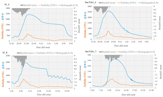 Rainfall, hydrographs and turbidity-pollutograph of events: S1_1; S1_3; S1_5; S1_6; S1_8; San Felix_1; San_Felix_3; San Felix_5; San Felix_6; and San Felix_7.