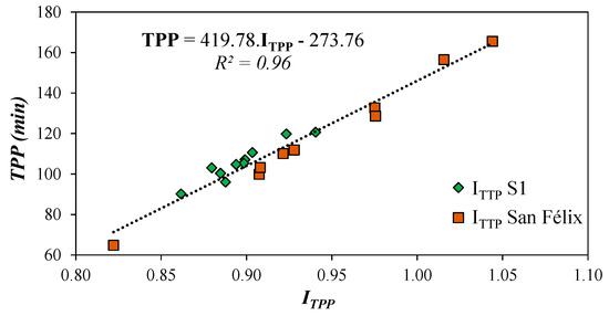 The first term of Equation (4), TPH/Tc, reflects the time of the catchment to respond as a function of: (i) how the rain is distributed proportionally to TPH; and (ii) the shape of the catchment inversely proportional to Tc. The second term, PTOTAL/PTOTAL_ANNUAL, magnitude of the rainfall, is also proportional to the time to the peak of the pollutograph. In this Equation, the term PTOTAL/PTOTAL_ANNUAL has lower influence on the index than TPH/Tc. However, its inclusion improves the adjustment from R2 = 0.87 to R2 = 0.96. Figure 6 shows the linear relationship between the pollutograph time to the peak index, defined in previous equation, and the time to the peak of pollutograph.