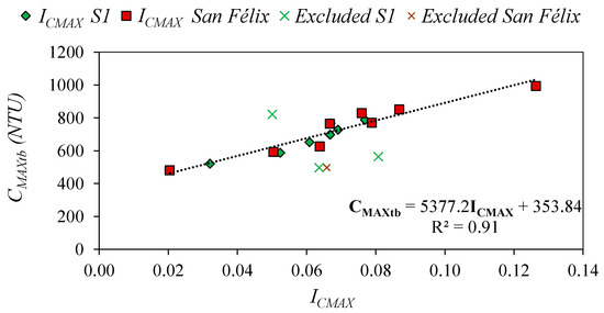 Figure 7 presents the values of ICMAX, calculated by Equation (6) for each rainfall event, and the maximum of measured turbidity in each event, CMAXtb. Most values fit around a line except four cases: