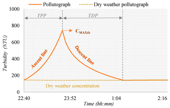 An application of the proposed model is the definition of pollutographs. In Figure 8, a standard pollutograph is shown. Pollutograph is modeled through the former index variables together with the pollutographs time to descent, TDP, proposed in Equation (10). Ascent and descent curves are proposed in Equations (9) and (11). Pollutographs estimated through this methodology agree reasonably well with the measured ones during the registered events (Figure 9). In this way, from a rainfall forecast, PTOTAL, and other variables such as the dry weather period, DWP, and the time to peak of the hydrograph, pollutographs can be simulated for multiple prognosis scenarios. Thus, the methodology provides information of the pollution during wet weather in combined sewer systems.