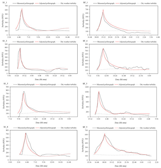 Figure 9 shows some of the measured pollutographs. They are compared with the pollutographs obtained by Equations (9)–(11). Results show a good agreement between measured and calculated pollutographs; therefore, the proposed methodology is suitable for estimating pollutographs from indexes.