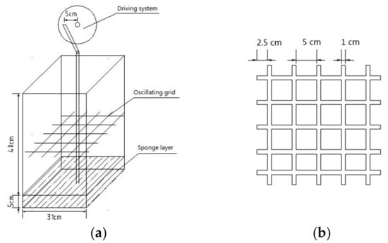 The OGT reactor constructed for this study had dimensions 31 cm × 31 cm × 45 cm. The width of the grille gridline was 1 cm, the center distance of two adjacent grid holes was 6 cm, and porosity was 0.69 (Figure 1). As the grid moves in the water reciprocally along a vertical line, it generates a stable, zero-average velocity and zero-shear force vibration grid turbulence []. The distance between the grid edge and tank wall was 0.5 cm—small enough to effectively remove the impact of the grid edge and the tank wall boundary. A 5 cm-thick sponge layer was set up at the bottom of the tank to absorb wave energy and to prevent wave reflection and superposition.