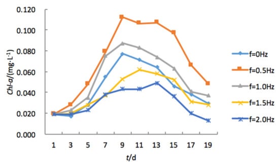 The experimental data also indicated that the time from the beginning of the experiment to the peak concentration depended on the turbulence strength of the water in the device. In the experiments, for the vibration frequencies of 0 Hz, 0.5 Hz, and 1.0 Hz, the Chl-a concentration reached its peak on the ninth day after the start of the experiment. However, when the vibration frequencies were 1.5 Hz and 2.0 Hz, the peak concentration took place on the 11th and 13th day after the start of the experiment, respectively.