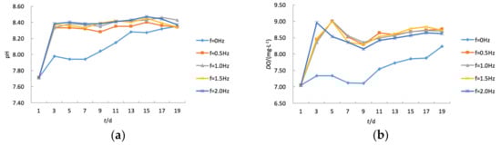 (a) pH concentration under different vibration frequencies; (b) DO concentration under different vibration frequencies.
