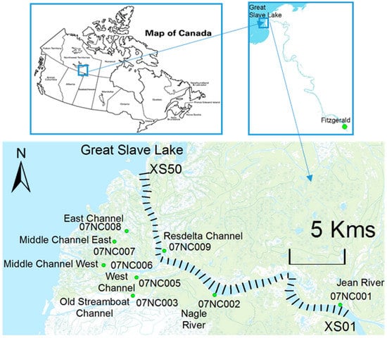The Slave River flows approximately 434 km northward from the Peace River and Peace-Athabasca Delta in Alberta to Great Slave Lake. This study focuses mainly on the delta of the river, the Slave River Delta, which is located at the mouth of the river at Great Slave Lake. The study area of this research extends from the Jean River to Great Slave Lake, approximately 25 km along the most downstream part of the main channel of the river (Figure 1). The drop in elevation at this part of the river is very low, with a gradient of 0.00003 m/m. The Resdelta Channel is the main channel, from which four other tributary channels, the Middle, Steamboat, and Nagle channels, and the Jean River, branch through the Slave River Delta. The mean annual flow of the Slave River is 3400 m3/s []. Regulation of flow by the W.A.C Bennett Dam in the upper reaches of the Peace River moderates the seasonal difference in the flow, typically resulting in increasingly low natural winter flows and decreasingly high natural summer flows. The ice-cover season in the Slave River Delta extends from November to May. Before 1980, the frequency of high-magnitude discharge was once every two years; since 1980, this frequency has been once every five years []. This decreasing trend in flood frequency the past several decades shows the drier conditions in the Slave River delta.