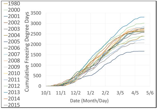 Various methods for ice volume evaluation have been used, including modeling, direct measurements and the combination of these two [,]. We present a novel technique in which remote sensing datasets are applied to calculating the extent of the ice cover and, using an empirical equation to estimate ice thicknesses (h) as a function of both Cumulative Freezing Degree Days (CFDD) and the average channel width in the Slave River Delta, derive an ice volume for downstream ice jamming. After comparing many equations for ice thickness (details about two other equations can be found in []), Stefan’s equation showed the highest consistency with gauged data. Although it is more accurate and reliable to measure the ice thickness using direct measurement or remote sensing technology, the Stefan equation can still reasonably estimate thermal ice growth, even if it does not consider snow depth, which can affect the accuracy of ice thickness calculations. However, while snow depth data were not available for the Slave River Delta, the Stefan equation still provided reasonable ice thickness estimates. RADARSAT-2 will be utilized for ice thickness estimation in future research to compliment the ice thickness calculation. Plots of the CFDD for all winters from 2000 to 2015 and the winter of the year 1980 is shown in Figure 2. The relationship between ice thickness and is , where is a constant. Thawing effects on ice volume can be accounted for by determining the cumulative average air temperature degrees surpassing −5 °C. Thus, thawing effects were used to attenuate in spring.