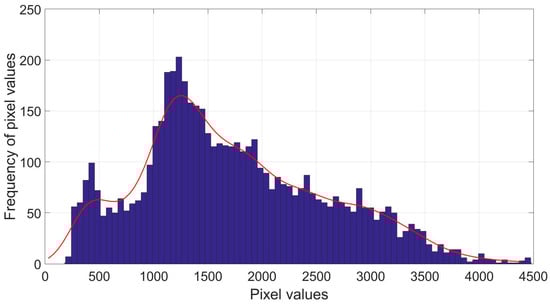 MOD09GQ band2 (wavelength: 841–876 nm, resolution: 250 m) datasets were used to establish time series to estimate the ice cover situation of the Slave River []. Different pixel values in the MODIS images represent different backscatters to which threshold values are applied to distinguish water from ice. By creating the histogram, the distribution of pixel values for each image can be determined. Clear water provides little backscatter signal to the satellite since it absorbs longer wavelengths and the reflected shorter wavelengths tend to scatter in the air. Hence, longer wavelengths appear more sensitive to the difference between water and ice. Since MOD09GQ band2 is longer in wavelength than band1, it has been chosen for our ice phenology research. A heat balance calculation based on upstream river temperature may help determine how much ice is melting and moving respectively. This calculation requires more extensive field sampling and can be addressed in future work. Due to this characteristic of clear water, it appears dark on MODIS imagery. On the other hand, ice provides more reflectance and appears lighter than clear water on the MODIS imagery []. This difference leads to the significantly different pixel values in the MODIS imagery. Pixel values, with only one feature variable (a pixel is either ice or water), are normally distributed. Theoretically, a mixture of two normal distributions forms a bimodal distribution. Figure 3 shows an example of the MODIS pixel-value distribution from 17 November 2002. On that day, both ice and water appear in the river, so that two distinct peaks (local maxima) representing ice and water can be found in the histogram, which is consistent with the bimodal distribution theory. There is a big difference between the pixel values of the ice and water, and a value separating the two establishes the threshold. On cloudy days, backscatter values are difficult or even impossible to attain. Hence ice volumes for those days have to be interpolated between clear-day images []. The algorithm Harmonic Analysis of Time Series (HANTS) was used to replace cloud-contaminated pixels with Fourier series values from MODIS images []. After interpolation, pixel values change so that another threshold must be applied to the interpolated images. Applying the threshold to the MODIS image pixel-value distributions, percentages of water and ice can be measured as well as ice volumes. During the ice breakup period, the diminishing ice of the upstream reach is considered to be inflowing ice at the downstream ice jam. We do make allowance for the recession of the ice front by tracking the location of the ice front at a daily time resolution using the MODIS imagery. Ice motion velocities in the year 2000–2015 were approximately 48–100 km/day. Based on the ice front movement, inflowing ice can be tracked. One point of uncertainty is that not all of the ice downstream of the ice front may be moving; rather, some could be melting while stationary, due to warm inflow river water. However, it is very difficult or perhaps impossible to distinguish how much ice has moved from upstream to the delta, as opposed to just melting before the next image was acquired. A shorter time interval between image acquisitions would be necessary.