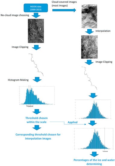 Ice volume calculation processes are shown in Figure 4 Using the Geographic Information System (GIS) [], the water surface area of the Slave River Delta was measured, which is 12.8 km2. Percentages of the ice cover on the Slave River Delta are calculated from MODIS datasets. An example of calculating ice percentages is shown in Figure 4.