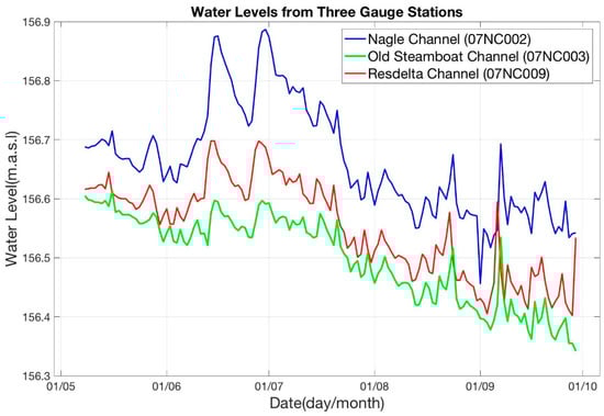 The change of water levels at the Jean River gauge (07NC001) occurred approximately one day earlier than at the Nagle Channel gauge (07NC002) and two days earlier than at the Resdelta River gauge (07NC009) (Figure 1).