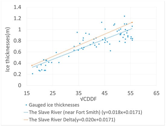 The CFDD was determined for each winter from mean daily air temperature records between 1971 and 2015. In the Stefan equation, the constant c depends on many factors such as meteorological conditions, geomorphological parameters, and water quality. It is derived empirically as the slope of a linear relationship between measured ice thicknesses and (Figure 7). Based on the field survey and relationship between ice thicknesses and at the Slave River Delta and its tributaries [], the constant c was estimated to be 0.021. The blue trendline shows the relationship between the ice thickness and of the Slave River near Fort Smith. The constant c equals 0.018. Hence, 0.02 has been chosen as the constant, and the trendline with a slope of 0.02 m/m is shown by the orange line in Figure 7.