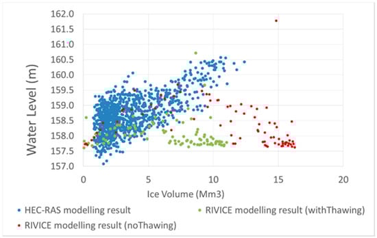 In Figure 10, three ice volume clouds (scatters showing the relationship between ice volumes and water levels) are shown. The cluster of blue dots show the modeling results of HEC-RAS, and the red ones and green ones show RIVICE modeling results with and without thawing effects. Thawing comes into effect for days on which average temperatures are above −5 °C. Clearly, the ice volumes are lower when thawing is incorporated in the calculation. The RIVICE clusters yield lower backwater elevations than HEC-RAS, which is to be expected, because not every jam that is formed is expected to be a fully-evolved equilibrium jam as premised by HEC-RAS. In HEC-RAS, stresses acting on an ice jam are calculated based on the ice jam force balance equation, while the deposition and erosion of ice covers are not taken into account [,]. In RIVICE, ice jam formation and development were considered in a dynamic balance process.