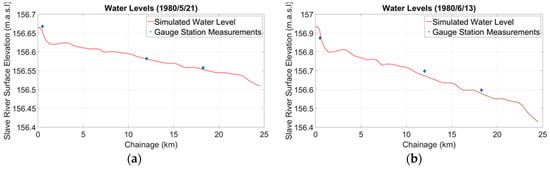 Calibration for RIVICE simulation under open water conditions: (a) water level profile under minimum daily flow; (b) water level profile under maximum daily flow.
