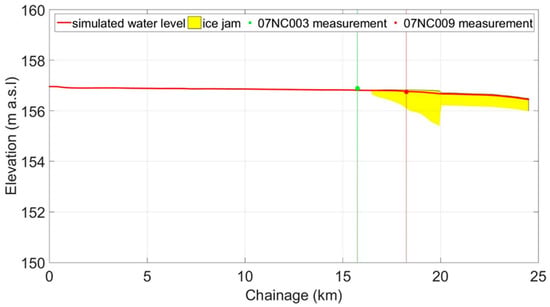 Figure 15 shows the floodwater extensions, calculated with HEC-RAS, within the floodplain for the ponding cover water surface at elevations of 156, 157, and 158 m. For instance, when the backwater level exceeds 156 m, the area to the left-hand side of the red line will be flooded. To determine the backwater effects of ice jamming, which causes flooding, the RIVICE model was run three times under the following conditions: open water, ice-covered, and ice-jammed conditions. These three scenarios were simulated using the same boundary downstream water level elevation (156.45 m), but different upstream water flows. Associated with the HEC-RAS simulated flood extension under different backwater levels, the RIVICE modeling results can help determine the maximum possible flooding extent in the floodplain under different situations.