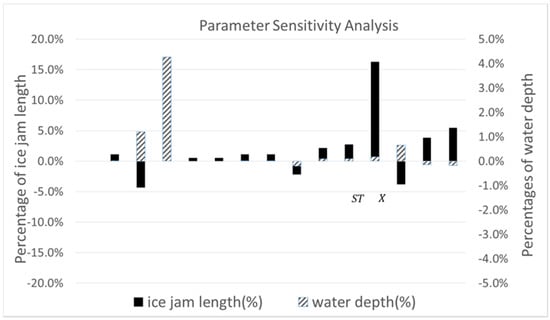 To quantify which factor influences the formation of ice jamming the most, a local parameter sensitivity analysis was carried out to calculate the sensitivity of different parameters on ice jam flooding. Local sensitivity (e) is defined as in []: