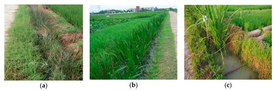In rice irrigation districts, there are a large number of natural drainage ditches that are mostly vegetated and play an important role in the ecosystem. Due to the fact that China faces serious non-point source pollution, such vegetated drainage ditches are also used for non-point source pollution control, such as removal of nitrogen and phosphorus, and sediment blocking []. Farmers also purposefully grow cash crops in those small drainage ditches for higher economic income. On the other hand, discharge capacity of ditches can be impacted by plants. Quantitative analysis and evaluation of the comprehensive impact of plants on both aspects is of significance for drainage ditch design, operation, and management.