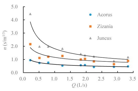 Roughness coefficient of drainage ditches with different plants at varied discharge flow rates.
