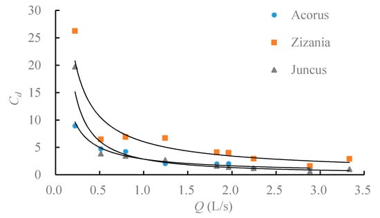 Equations (4) and (6) were used to calculate plant drag coefficient Cd’ and Reynolds number of plant stem Res at different water flow rates. The correlation of these two values were analyzed by Equation (5). Results suggested drag coefficients of different plants all declined as Reynolds number dropped (Figure 6). Fitting result could be fitted using the power function suggested by Equation (5). Value k of Juncus, Zizania latifolia, and Acorus calamus was 1.79, 1.65, and 1.49, respectively. Existing studies [,] indicated that this value was 1.0~2.0 in a non-submerged condition, in Wu et al’s paper, different value of k of vegetation was discussed both of his results and others’ results, k values are due to the differences in vegetation characteristics and may depend on the stiffness, density and configuration of the plants.